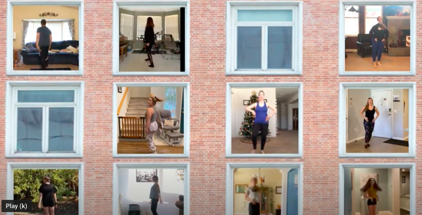 All singing was recorded individually at home and sent through a drop box to the music technician to be mixed. The first section of the choreography was also individually recorded at everyone’s homes. Then, the video editor brought all the videos together to simulate a stage performance.